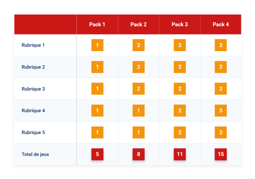 Grâce à ce principe, nous vous aidons dans le choix des jeux et activités proposées. Ensemble, nous convenons du pack adapté à votre événement. Puis, vous avez un nombre de jeux à choisir dans chaque rubrique de notre catalogue. À l’issue, vous vous retrouvez avec un pack diversifié permettant à chacun de jouer avec plaisir. C’est aussi la solution idéale pour découvrir ou redécouvrir des jeux traditionnels aussi addictifs qu’amusants.